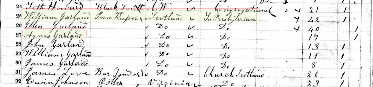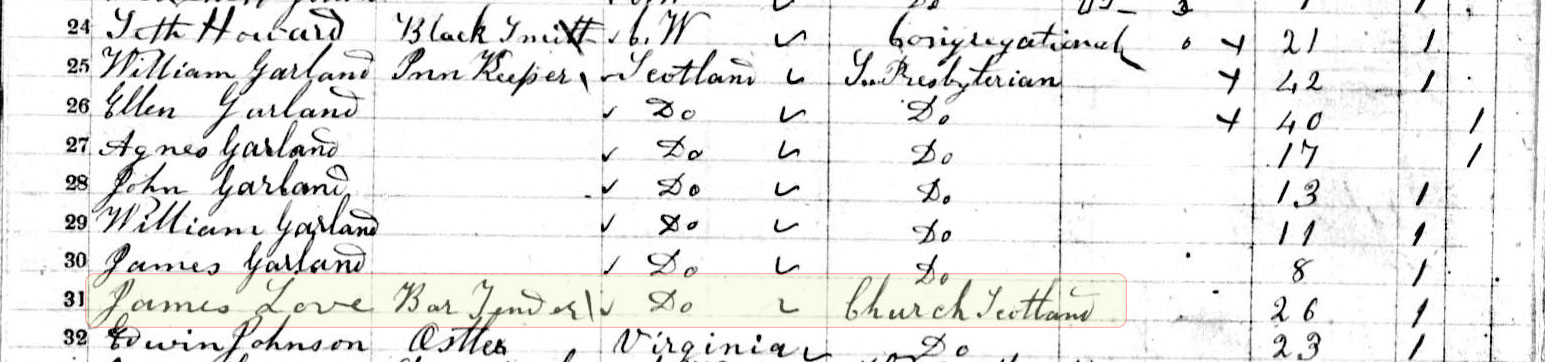 The 1851 census records Agnes Garland living with her parents, all identified as Presbyterian (Fig. 1). 4 In the same year, James Love appears separately, with his religion given as Church of Scotland (Fig. 2). 5 Both are listed as single. Agnes’s father is recorded as an innkeeper, while James Love is identified as a bartender.