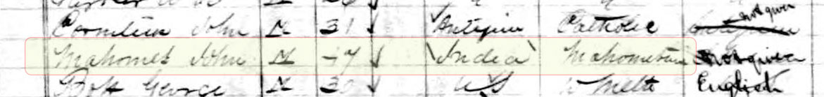 The 1881 census provides a clearer example of a Muslim individual in Canada: John Mahomet, age 47, born in India, religion Mahometan, with occupation listed as seaman (Fig. 11). 20