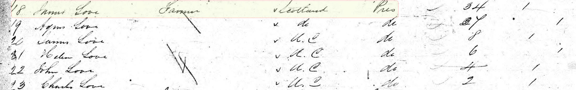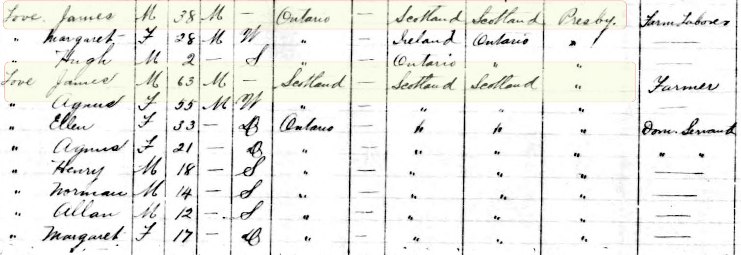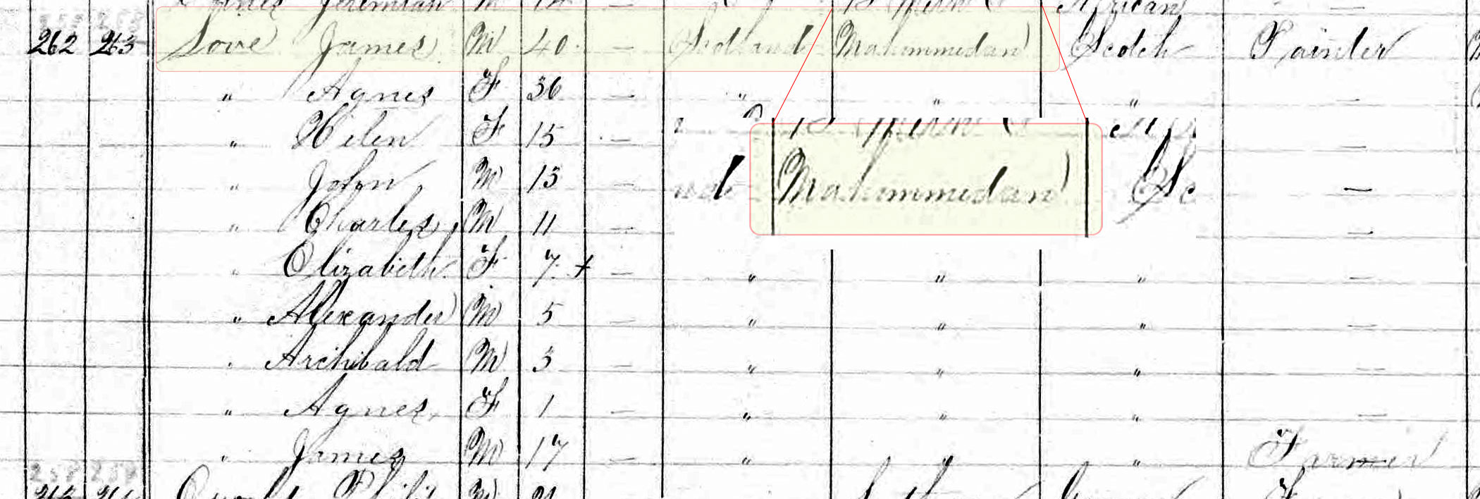 The census record does not support the conclusion that James and Agnes Love were Muslims. Instead, it documents a consistently Presbyterian household, with a single anomalous entry in 1871 that is not corroborated elsewhere.
