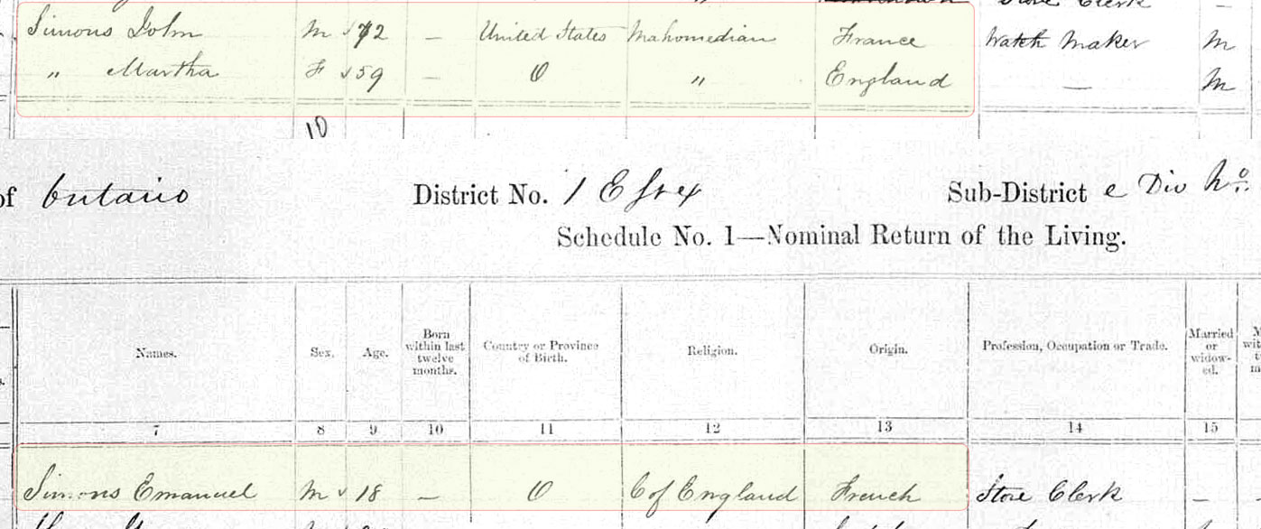 The 1871 census lists John Simons and Martha Simons with religion recorded as “Mohammedan” (Fig. 10). 14 However, on the following page within the same scan, Emanuel Simons is recorded as born in Canada, with religion listed as “Church of England,” and occupation as store clerk. 15